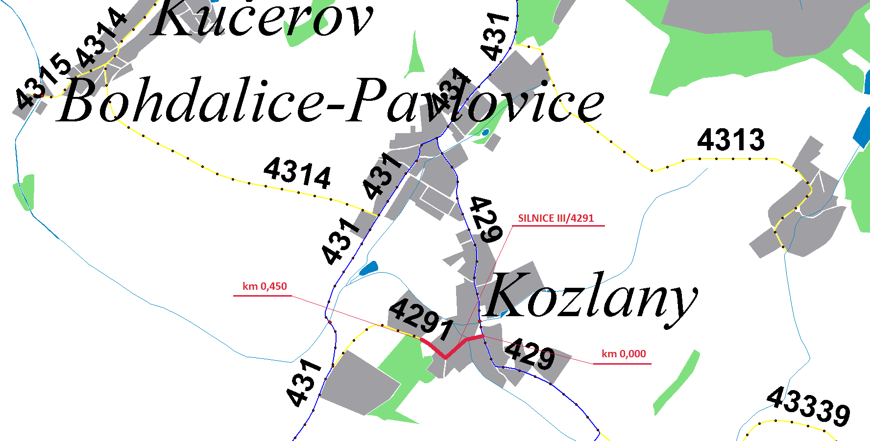 Stručný popis předmětu: Výměna obrusné vrstvy ACO 11 tl. 50 mm na ploše 1 650 m2 na polovině vozovky na silnici III/4291 v intravilánu obce Kozlany v km 0,000 - 0,450. Součástí je i oprava kanalizace.