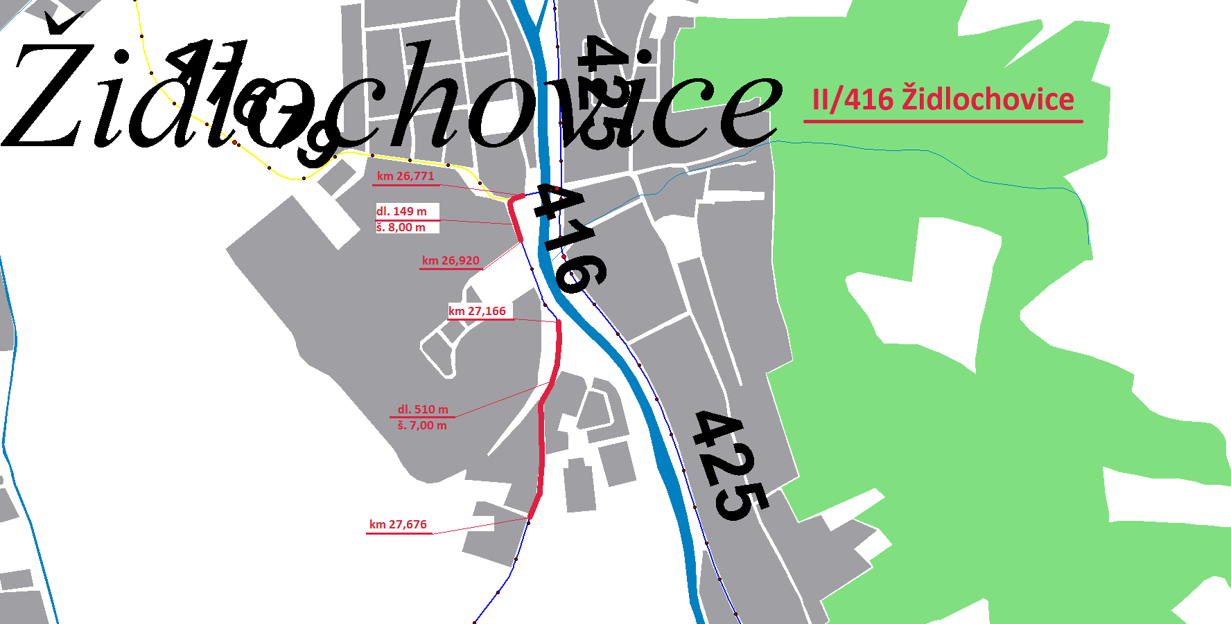 Stručný popis předmětu: Předmětem zakázky je výměna obrusné vrstvy ACO 11 tl. 50 mm na ploše 4 759 m2 na silnici II/416 v intravilánu města Židlochovice. Jedná se o dva úseky. Úsek č.1 je v km 26,771 – 26,920 dl. 149 m a šířky vozovky 8,00 m. Úsek č.2 je v km 27,166 – 27,676 dl. 510 m a šířky vozovky 7,00 m. V těchto úsecích bude třeba provést výškovou úpravu 5-ti krycích hrnců. VDZ plastem : na úseku č.1 - doplnění přechodu (2x) a stíny v křižovatce; na úseku č.2 - středová čára.