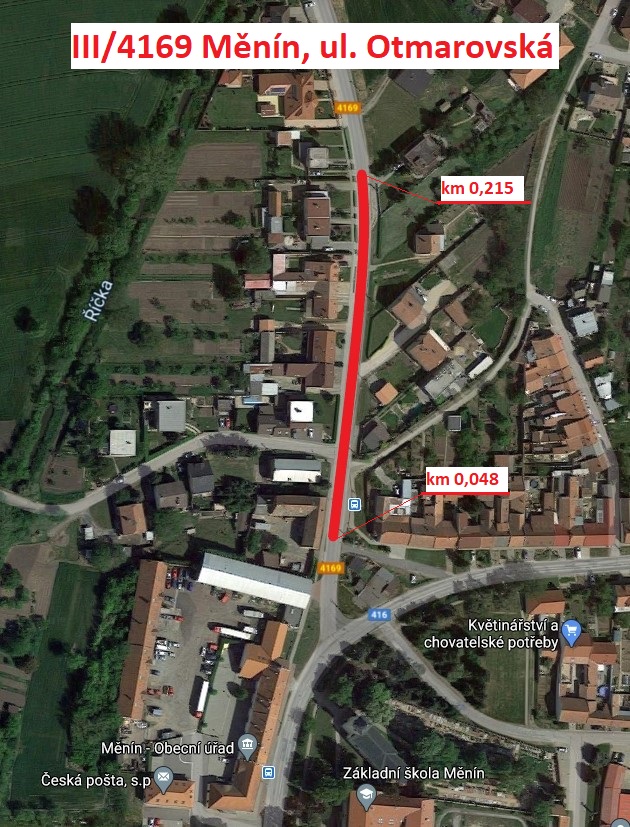Stručný popis předmětu: Předmětem zakázky je frézování a výměna obrusné vrstvy ACO 5 cm, včetně lokálního vyrovnání ložné vrstvy, doplnění konstrukční vrstvy, výšková úprava 4 uličních vpustí a úprava 5 revizních kanalizačních šachet v úseku silnice III/4169 v obci Měnín. Délka výměny obrusné vrstvy činí 167m v provozním staničení – km 0,048 – 0,215.