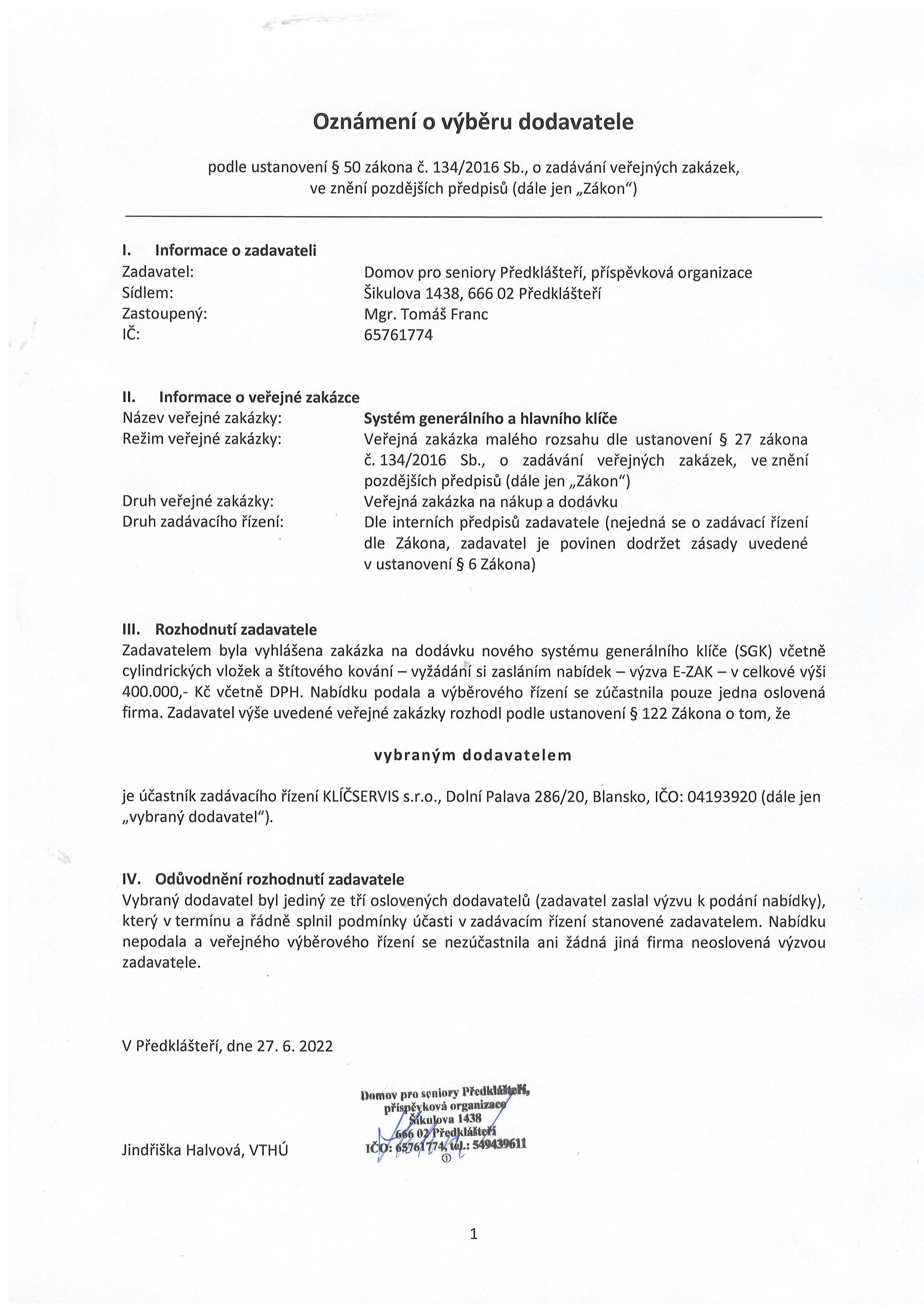 - Úřední název: Domov pro seniory Předklášteří, příspěvková organizace