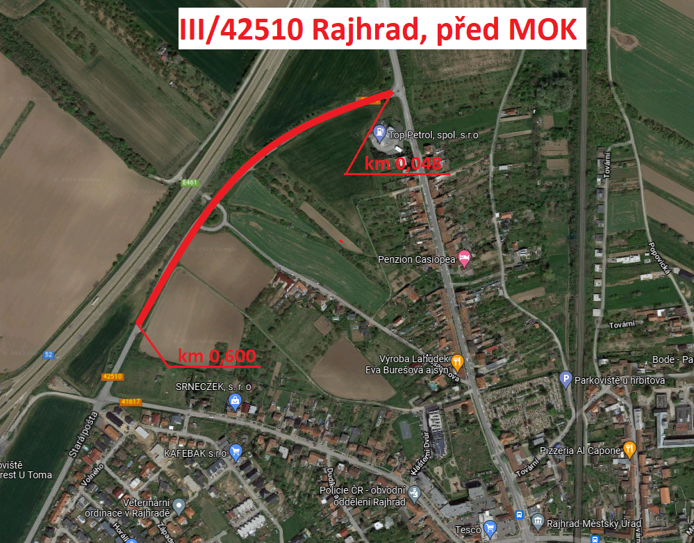 Stručný popis předmětu: Předmětem zakázky je oprava silnice III/42510 u Rajhradu v provozním staničení - km 0,048 - 0,600 (délka výměny vrstev činí 552 m). Směrové i výškové řešení se drží trasy stávající komunikace.