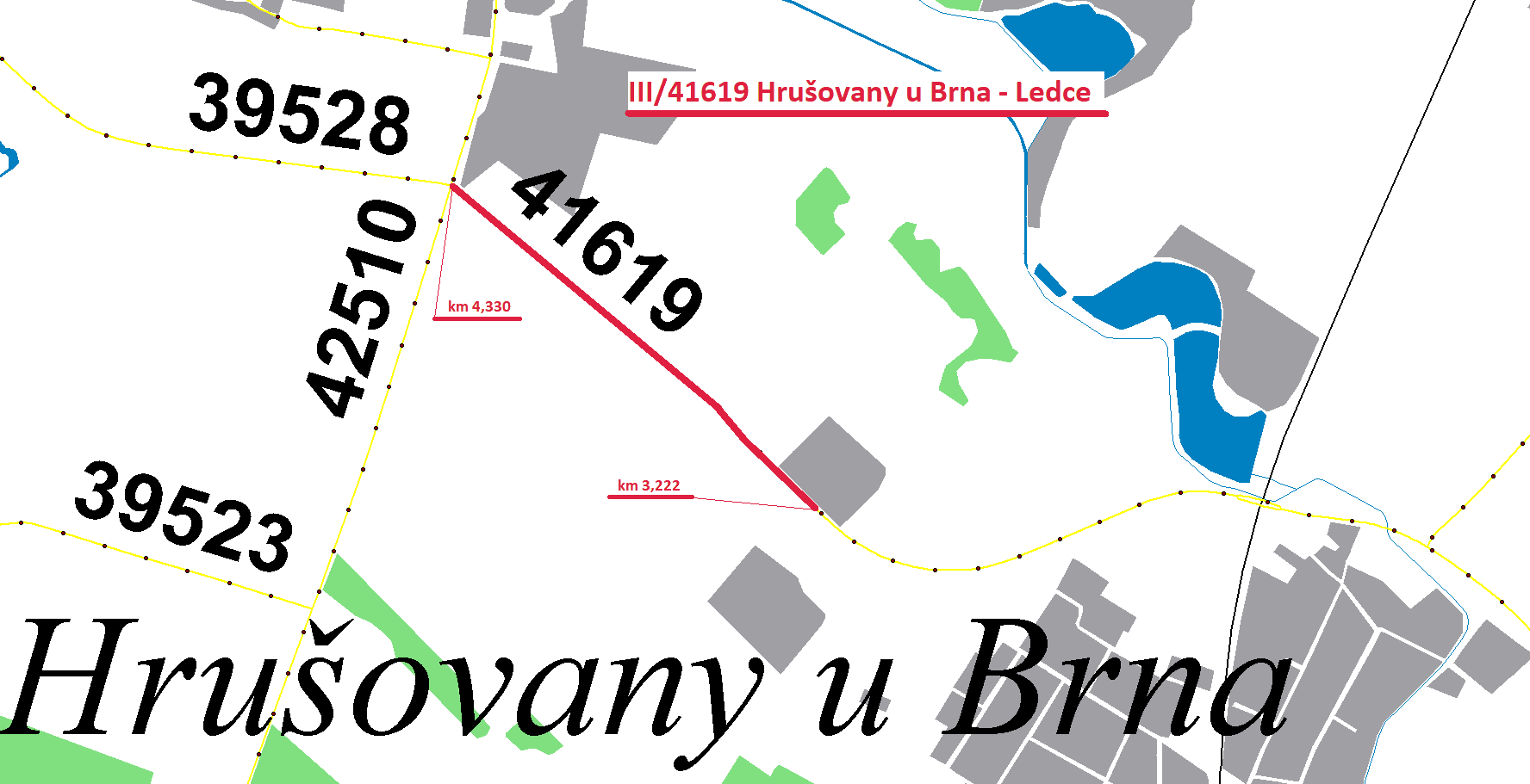 Stručný popis předmětu: Předmětem zakázky je frézování a pokládka obrusné vrstvy ACO 11 tl.4 cm a ložné vrstvy ACL 16 tl.6 cm včetně VDZ barvou – čára vodící a středová v úseku silnice III/41619 mezi obcemi Hrušovany u Brna a křižovatkou Ledce. Délka pokládky obrusné vrstvy činí 1 108 m, na ploše 7 040 m2 povrchu vozovky v provozním staničení km 3,222 – 4,330.