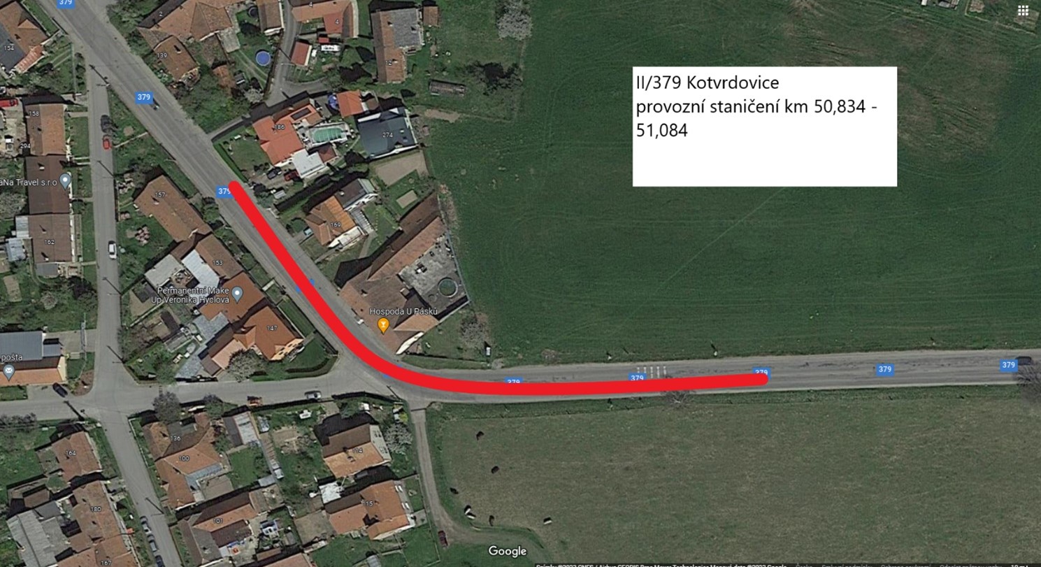 Stručný popis předmětu: Předmětem zakázky je výměna obrusné a ložné vrstvy vozovky. Frézování 2050m2 do 10cm, výměna ložné ACL 16+ a obrusné vrstvy ACO 11+ na ploše 2050m2, doplnění dělící čáry a plošného značení v barvě v úseku silnice II/379 Kotvrdovice. Délka výměny obrusné vrstvy činí 250m v provozním staničení – km 50,834 -51,084.