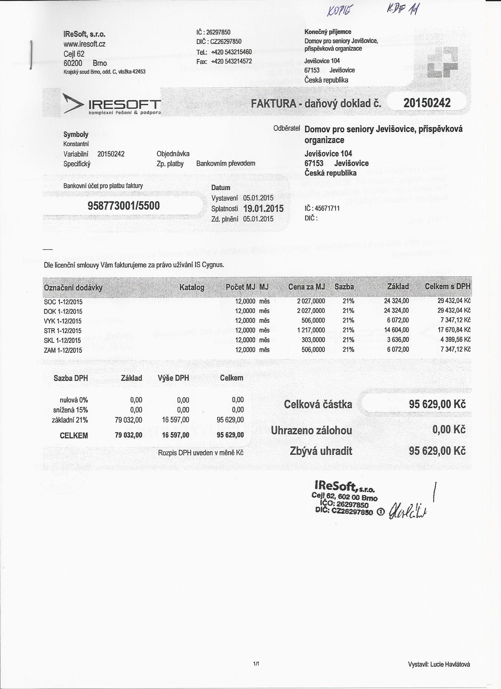 Faktura č. 20150242 | právo užívání IS Cygnus | ostatní dokumentace - veřejná |