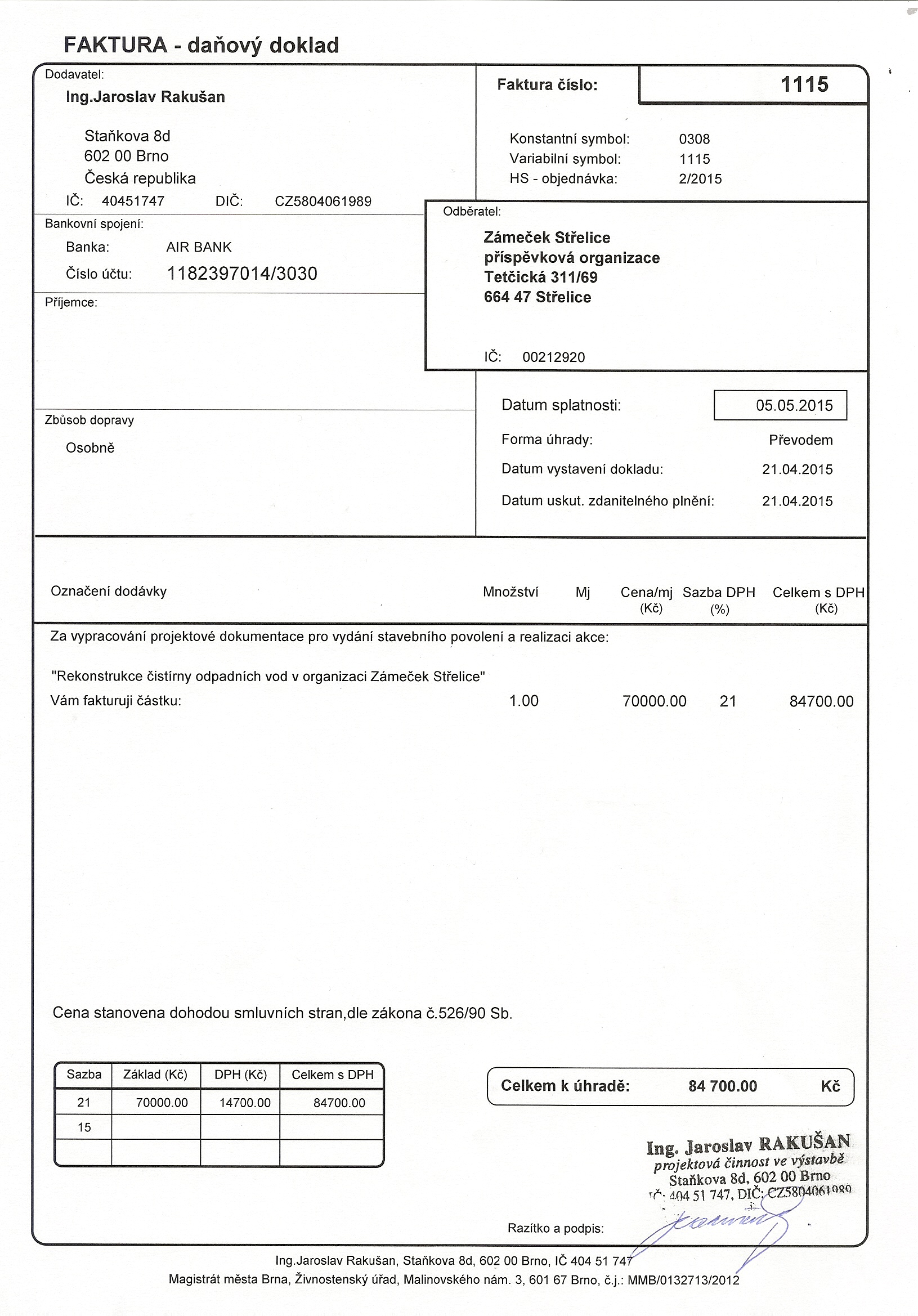 | Název: | faktura na PD - rekonstrukce ČOV |