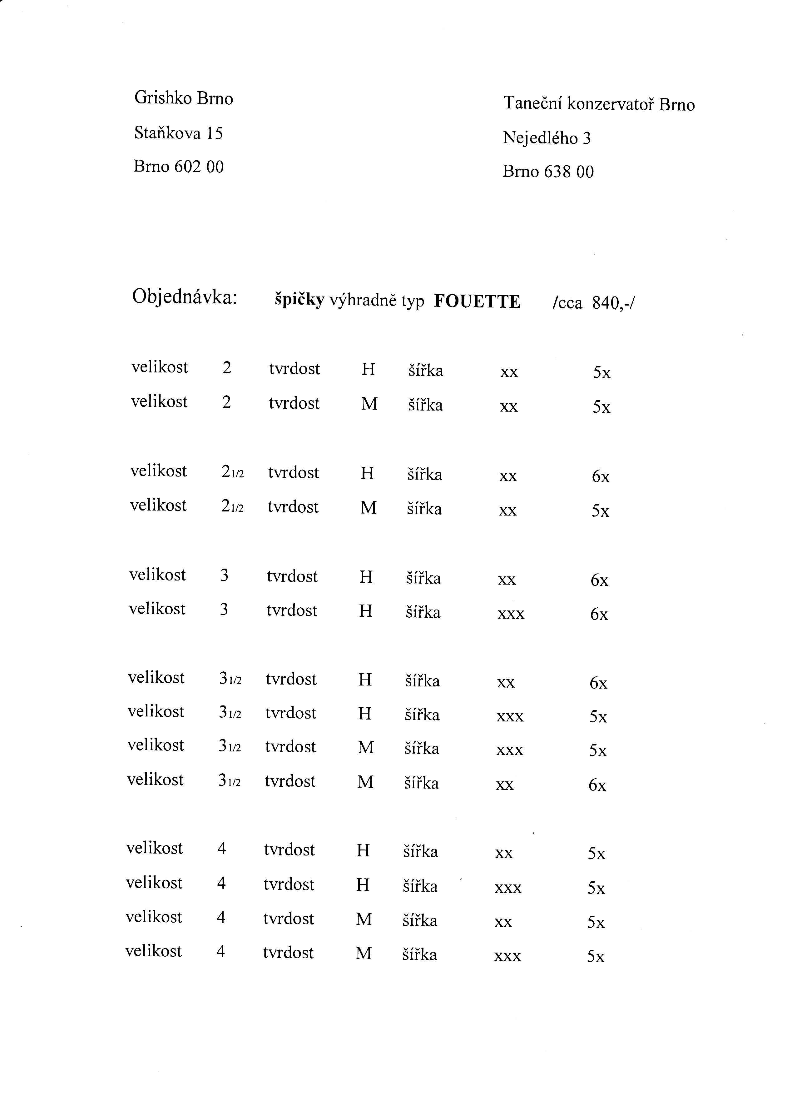 Objednávka baletních bot | Baletní špičky a piškoty | ostatní dokumentace - veřejná |