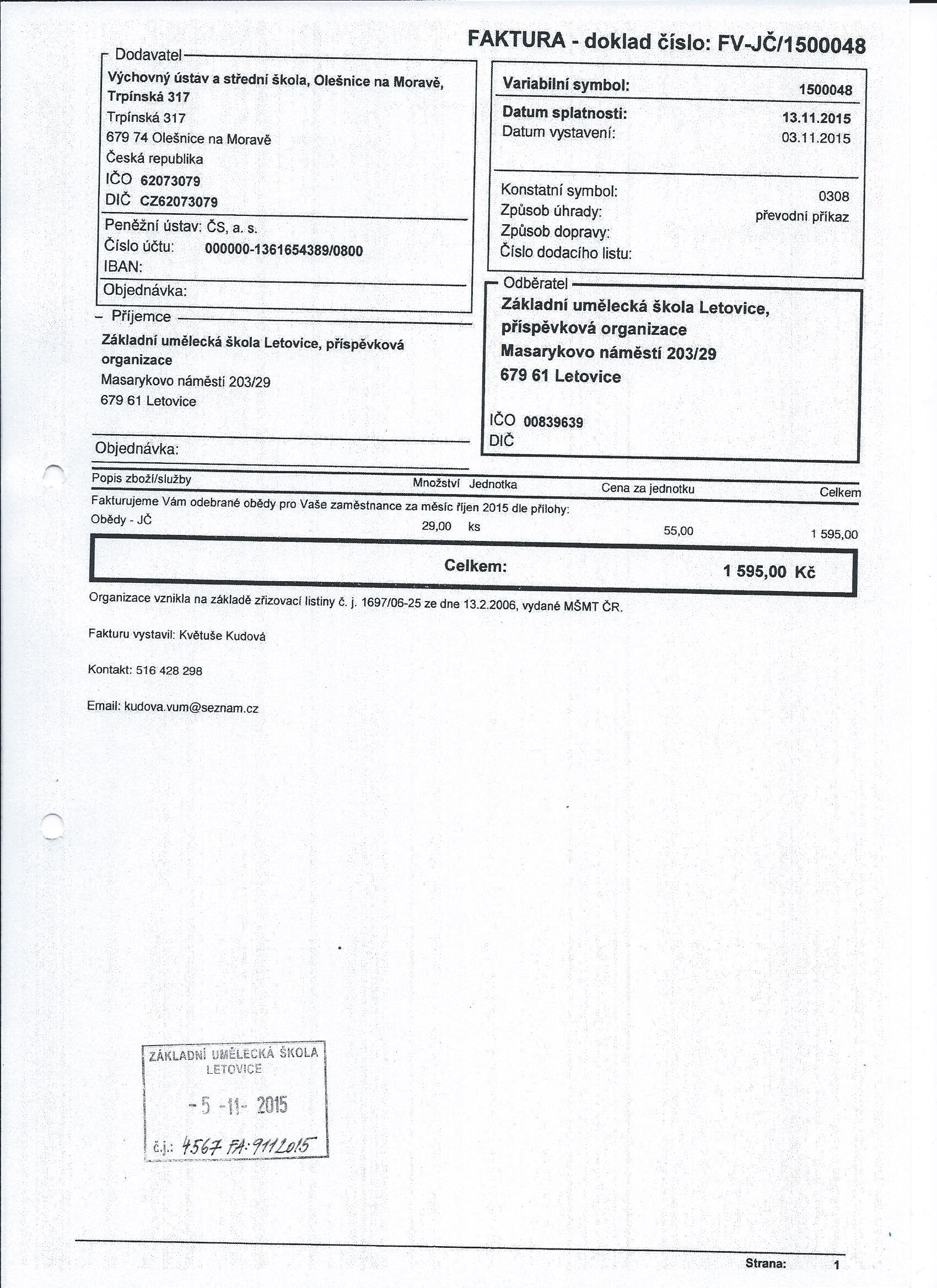 Faktura FV-JČ 1500048 | stravování zaměstnanců - říjen 2015 | ostatní dokumentace - veřejná |