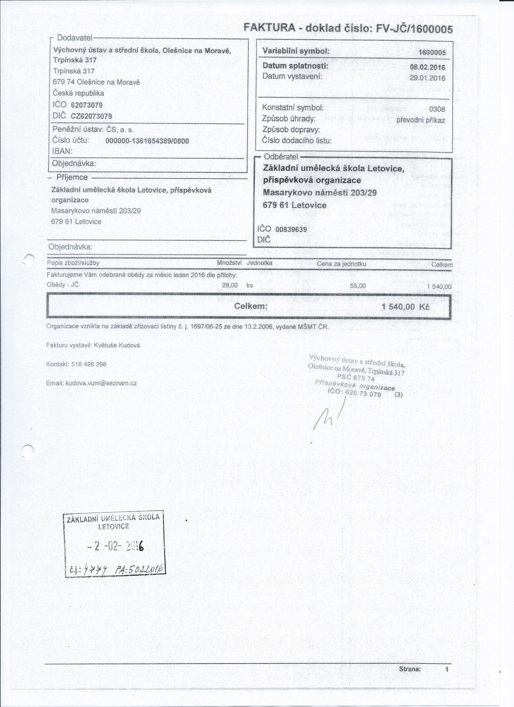 Faktura č. FV-JČ1600005 | stravování zaměstnanců - leden 2016 | ostatní dokumentace - veřejná |