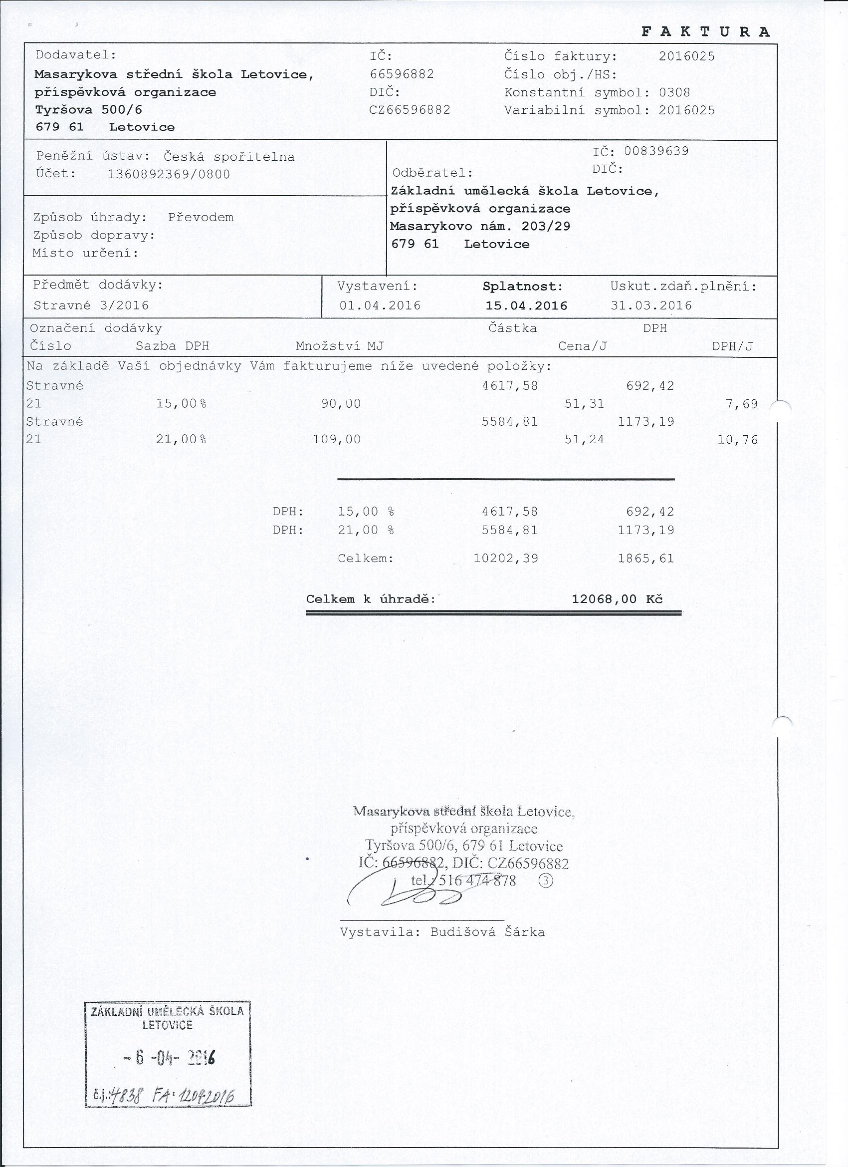 Faktura č. 2016025 | stravování zaměstnanců - březen 2016 | ostatní dokumentace - veřejná |