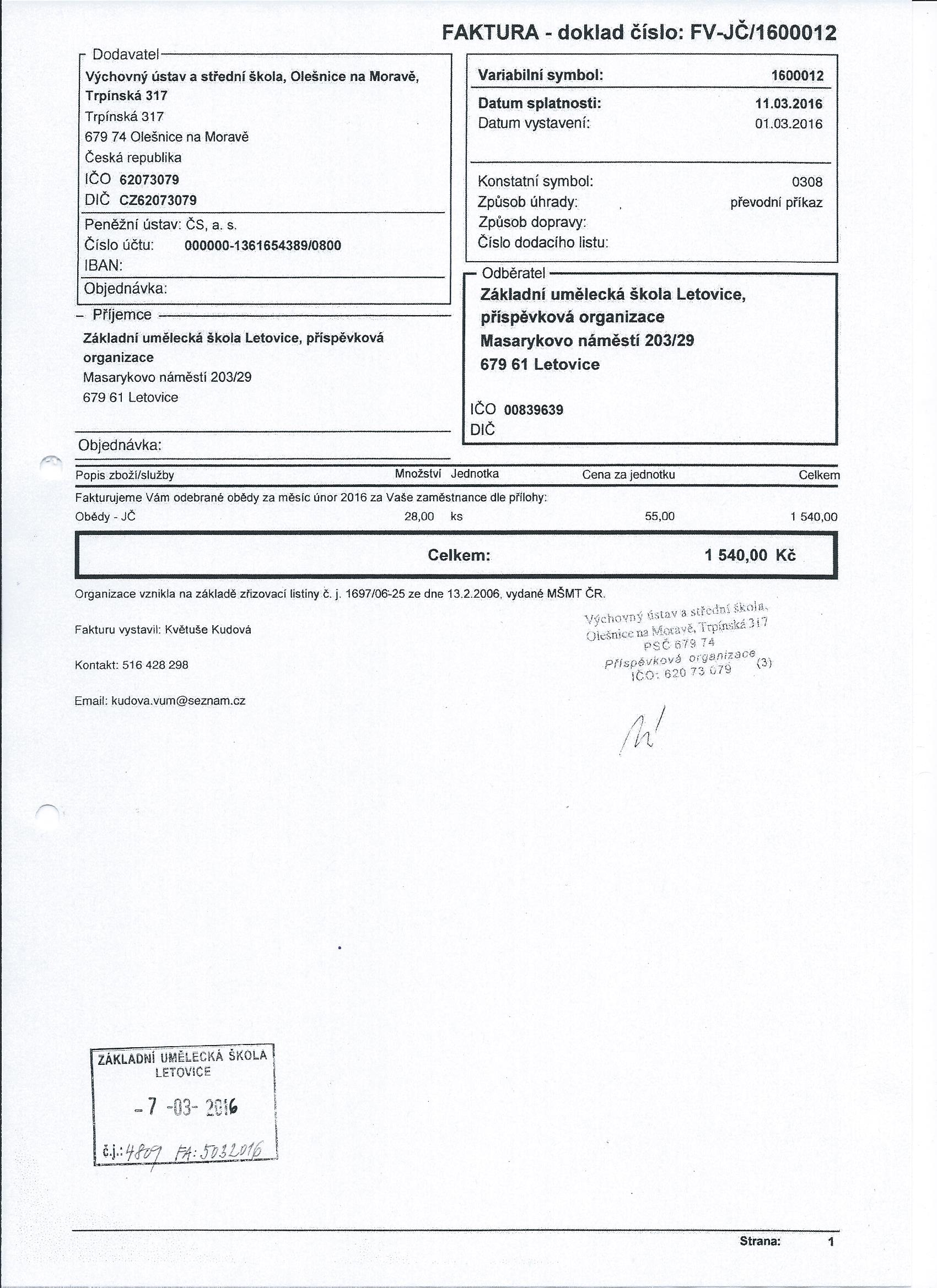 Faktura FV-JČ1600012 | stravování zaměstnanců - březen 2016 | ostatní dokumentace - veřejná |