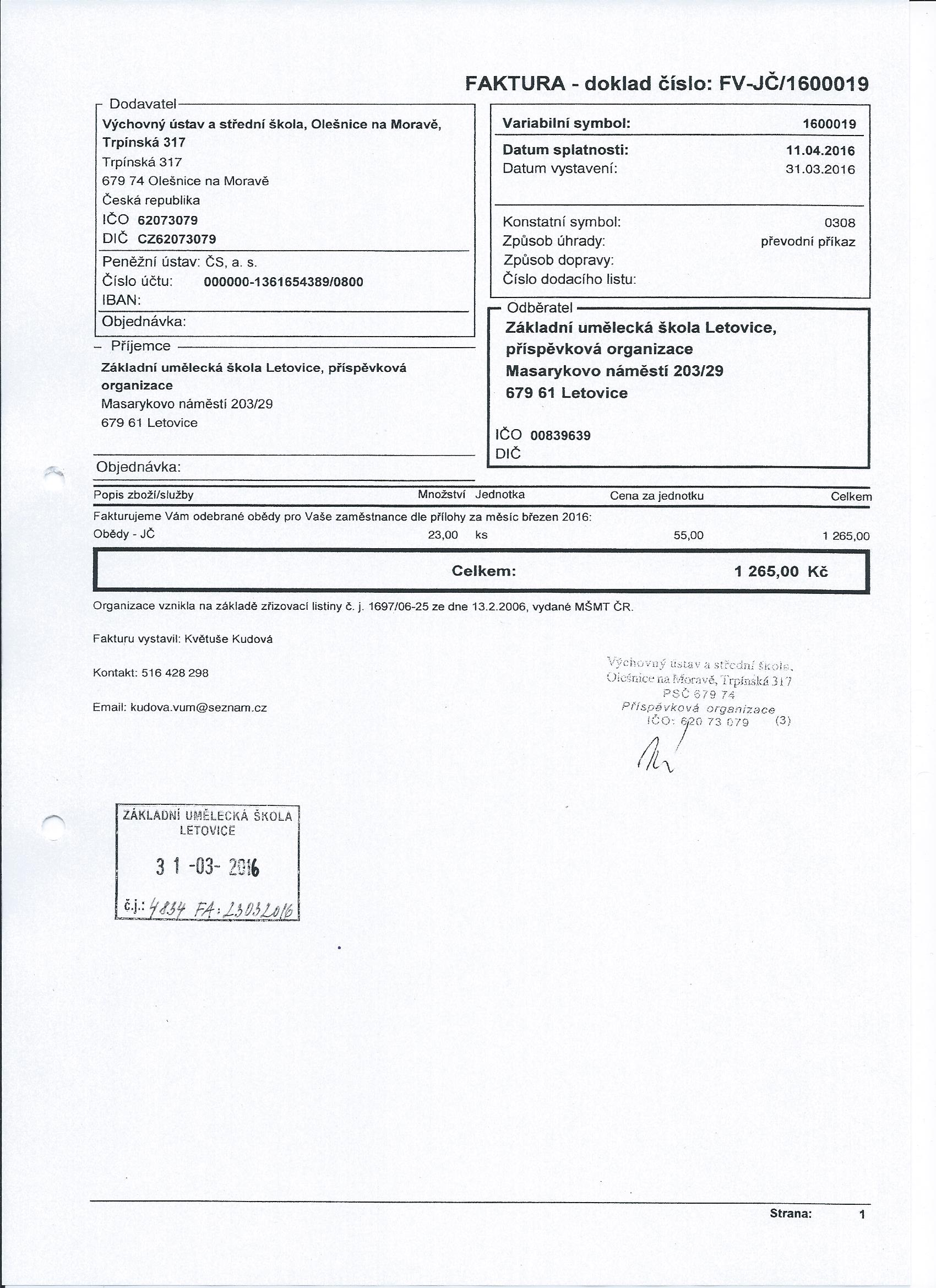 Faktura FV-JČ1600019 | stravování zaměstnanců - březen 2016 | ostatní dokumentace - veřejná |