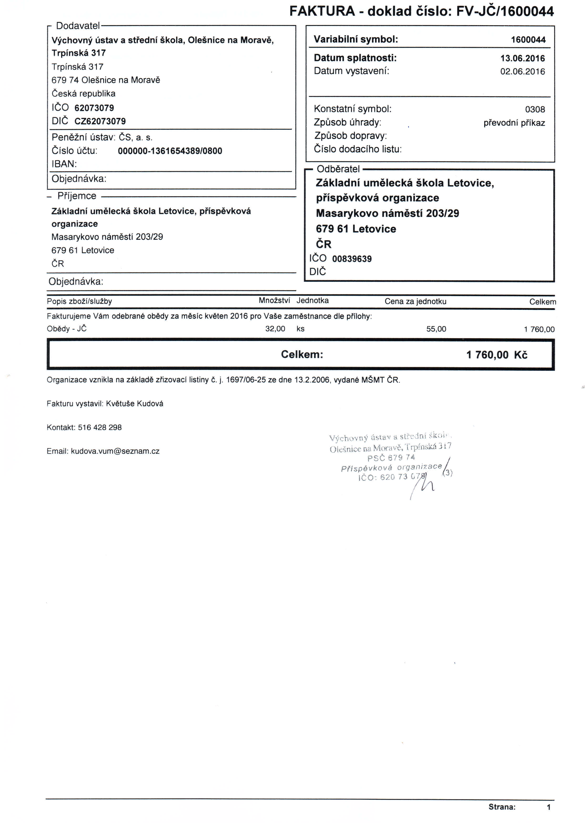 Faktura FV-JČ/1600044 | stravování zaměstnanců - květen 2016 | ostatní dokumentace - veřejná |