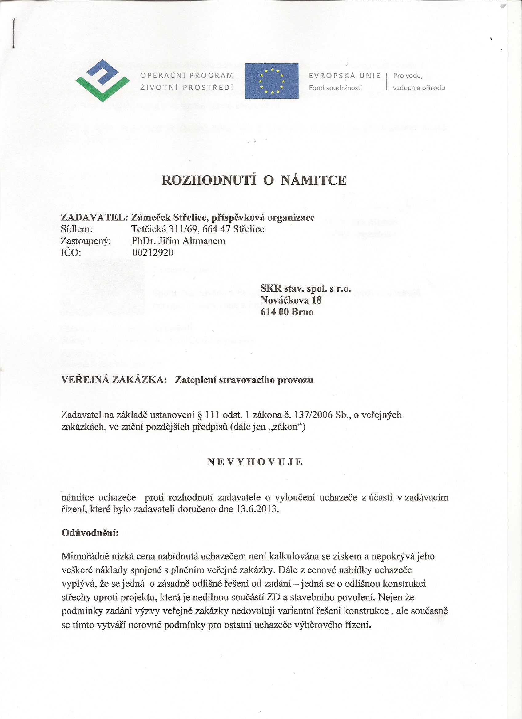 Dodatečné informace | Rozhodnutí o námitce | ostatní dokumentace - veřejná |