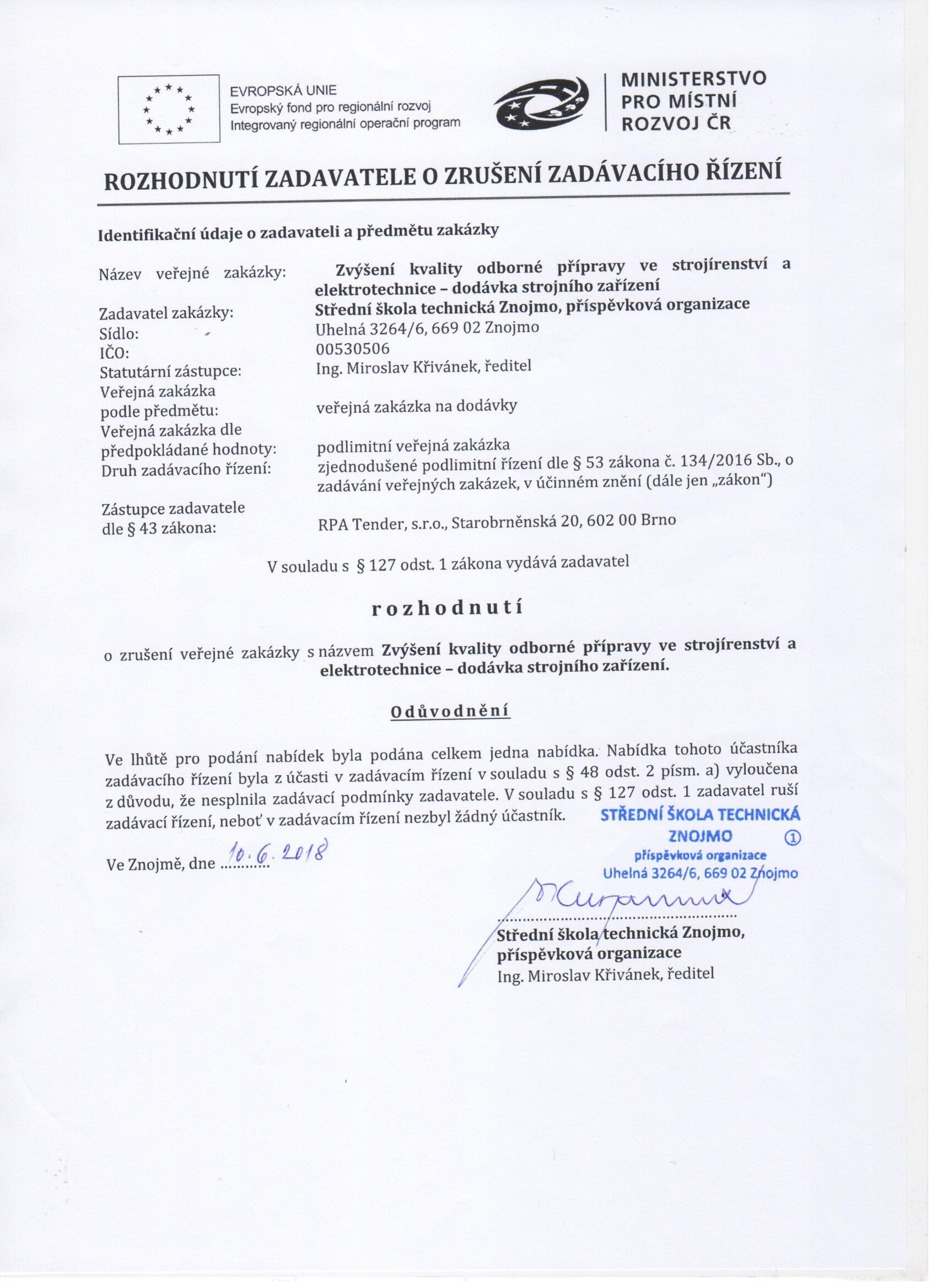 | Název: | Rozhodnutí zadavatele o zrušení |